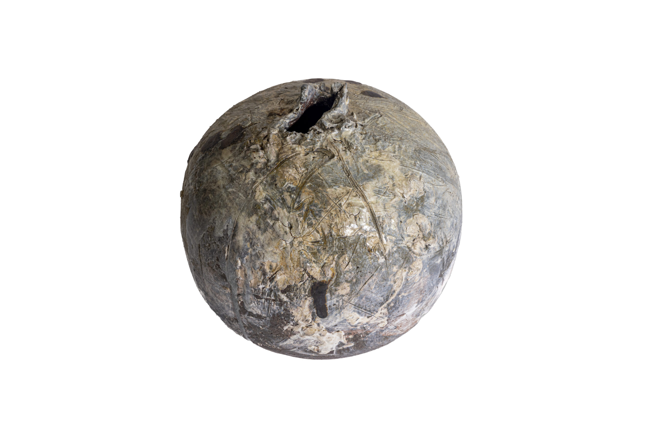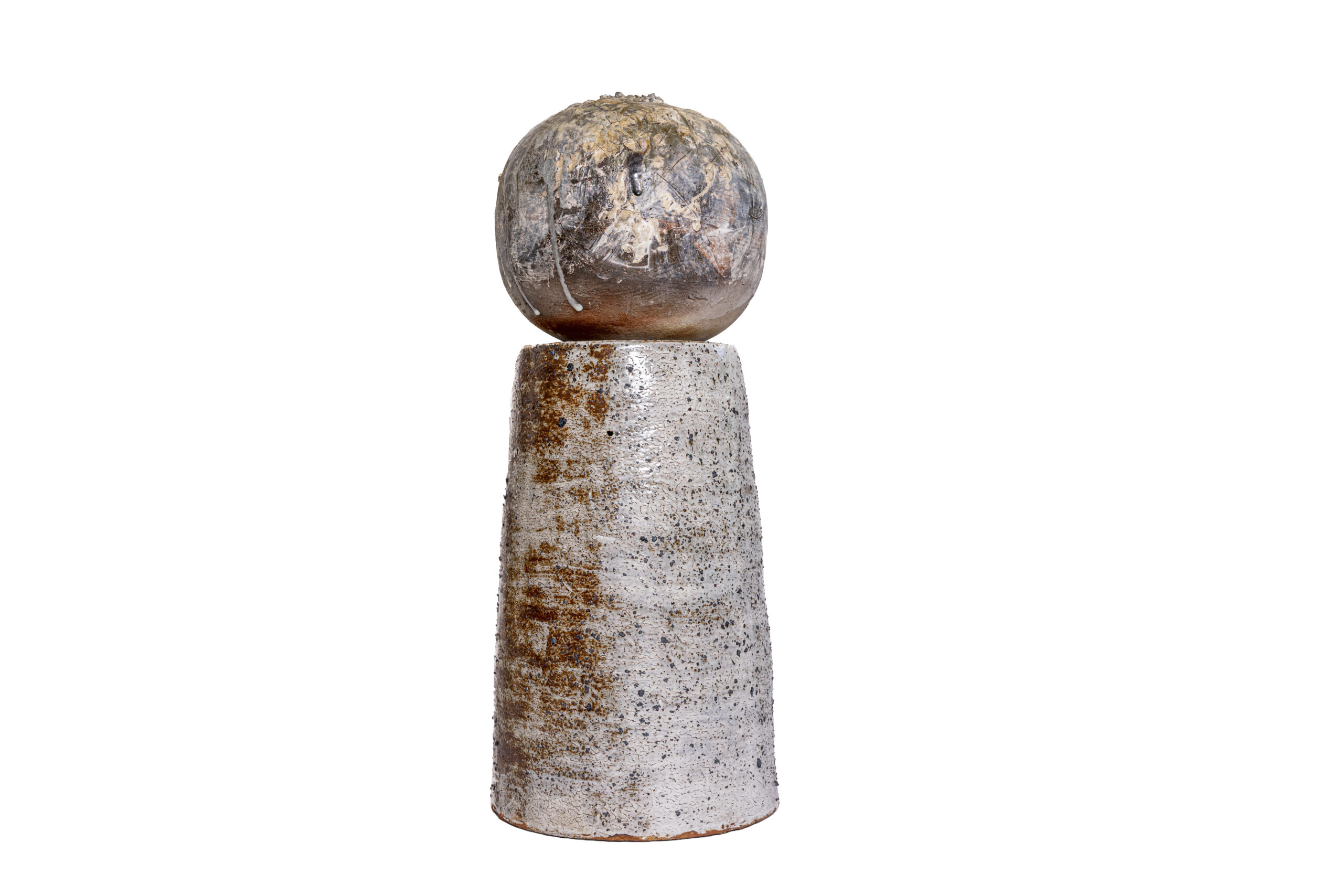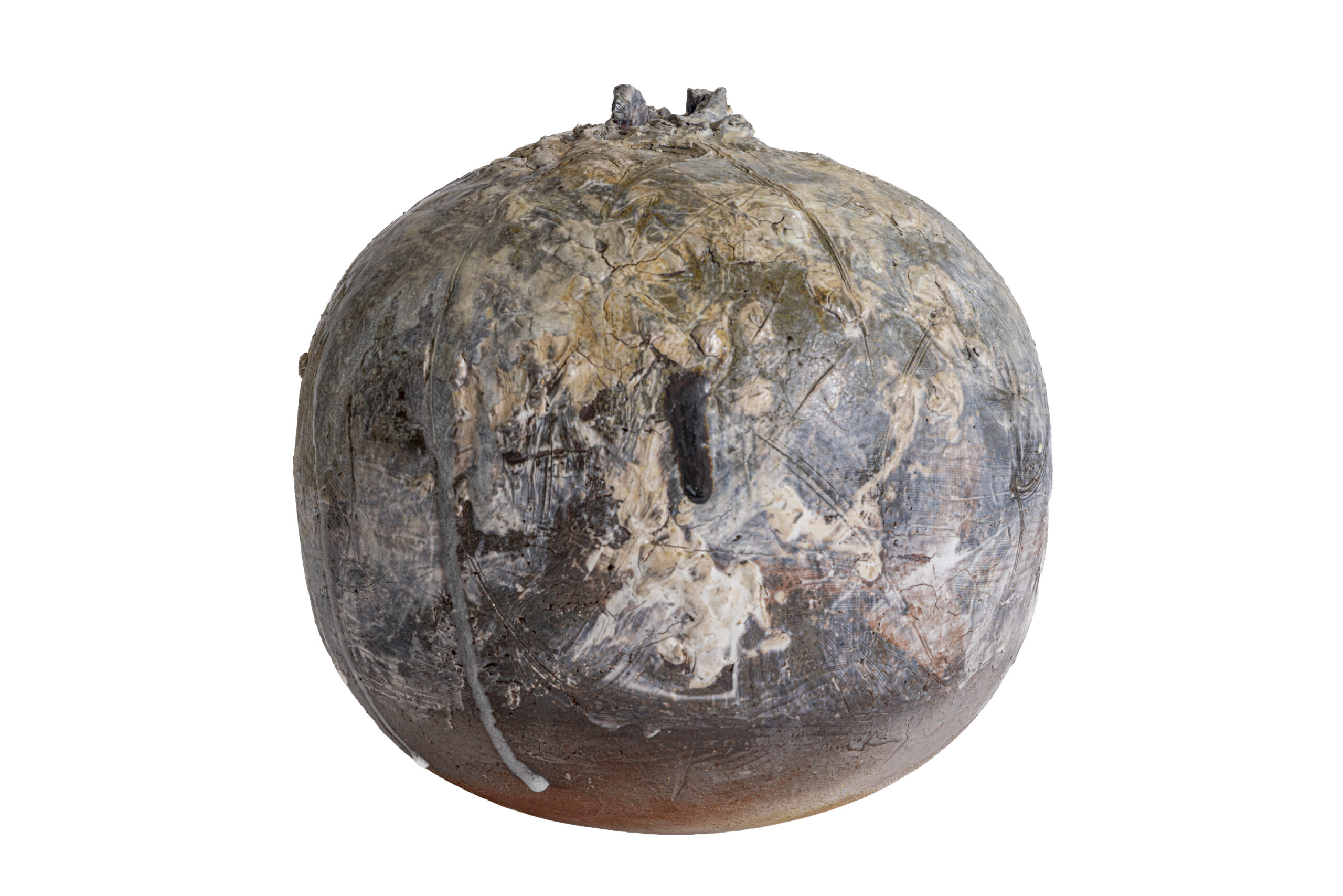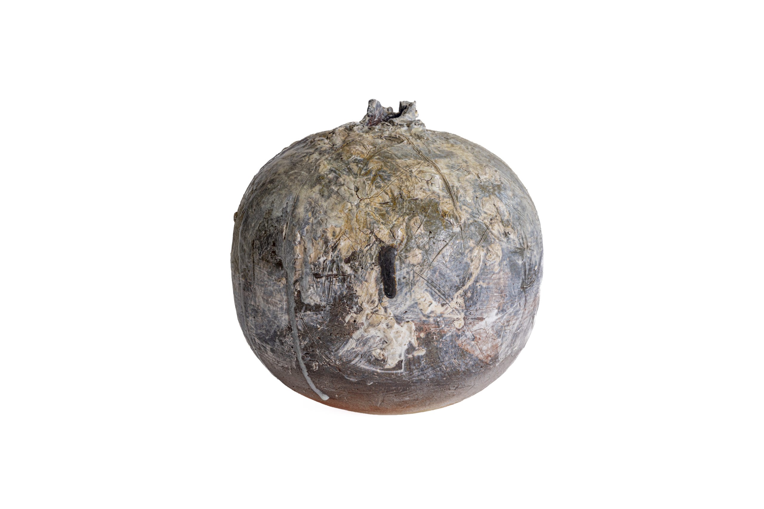 Fired in the Anagama kiln, the jar’s expansive, spherical volume—described by the artist as a “bursting shape”—acts as a canvas for the violence of the firing process. The surface is a topography of ash and flame, a rugged counterpoint to the serenity of the form’s silhouette. This tension between the rough, scorched skin and the perfect equilibrium of the sphere creates a stabilizing presence, channeling the generative, feminine force of creation into a singular object of monolithic silence.