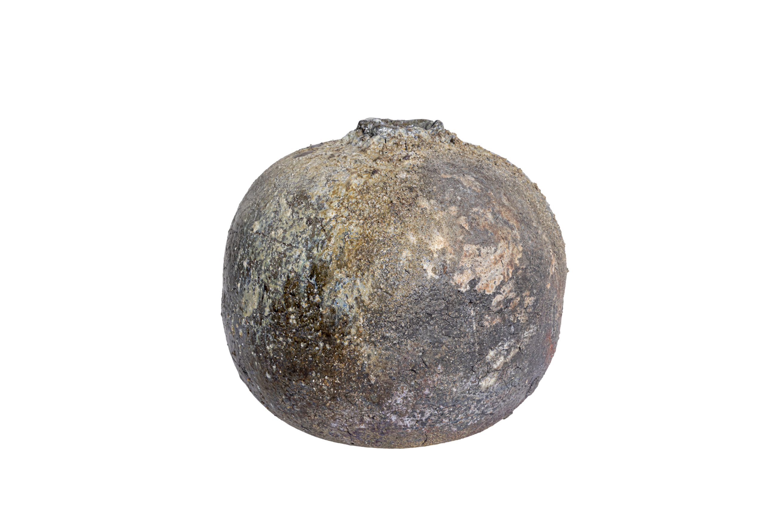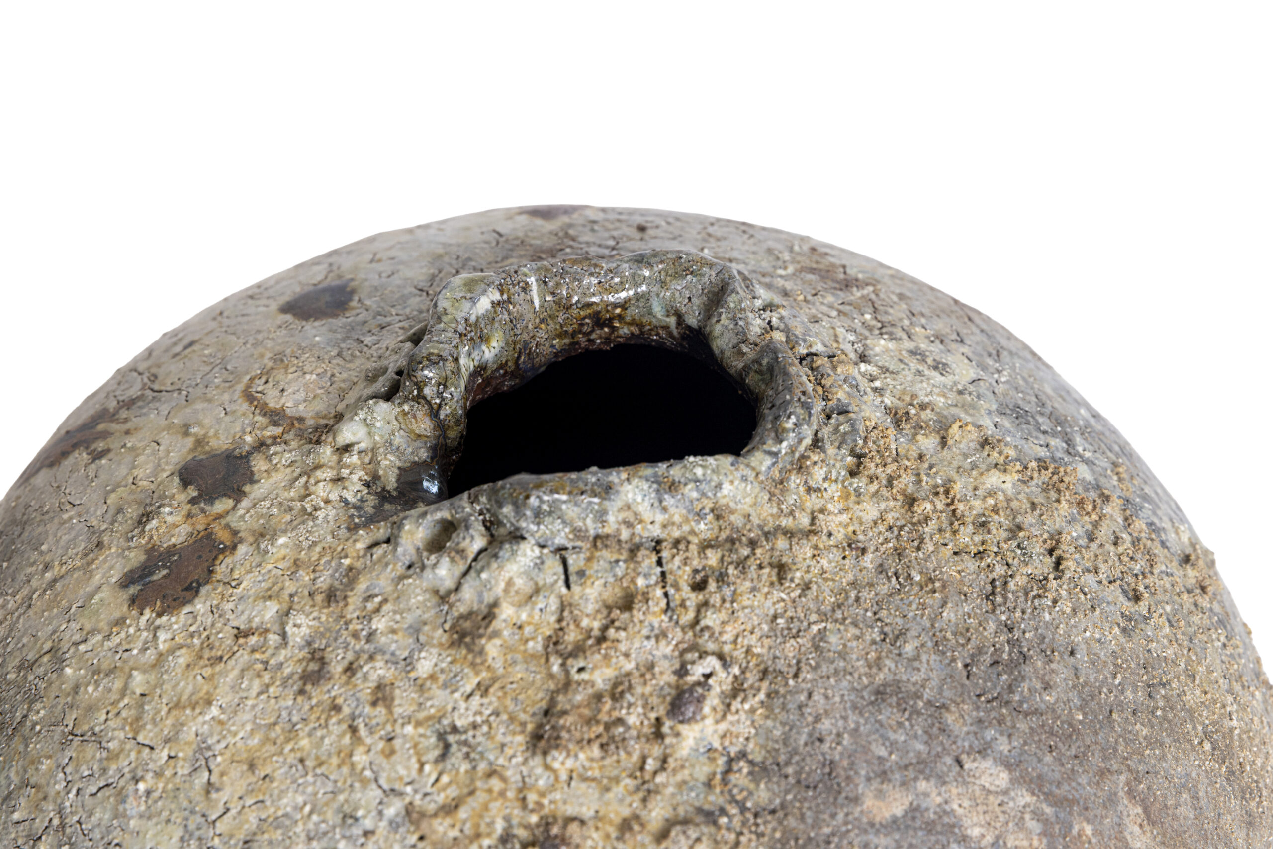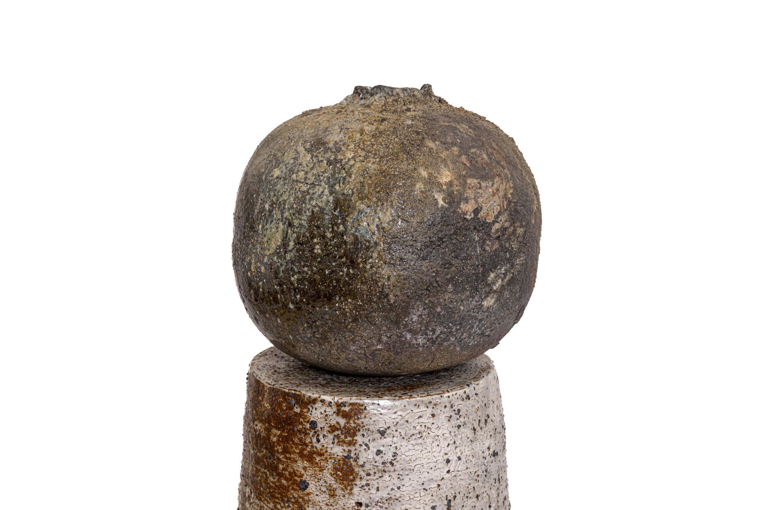 Fired in the Anagama kiln, the jar’s expansive, spherical volume—described by the artist as a “bursting shape”—acts as a canvas for the violence of the firing process. The surface is a topography of ash and flame, a rugged counterpoint to the serenity of the form’s silhouette. This tension between the rough, scorched skin and the perfect equilibrium of the sphere creates a stabilizing presence, channeling the generative, feminine force of creation into a singular object of monolithic silence.