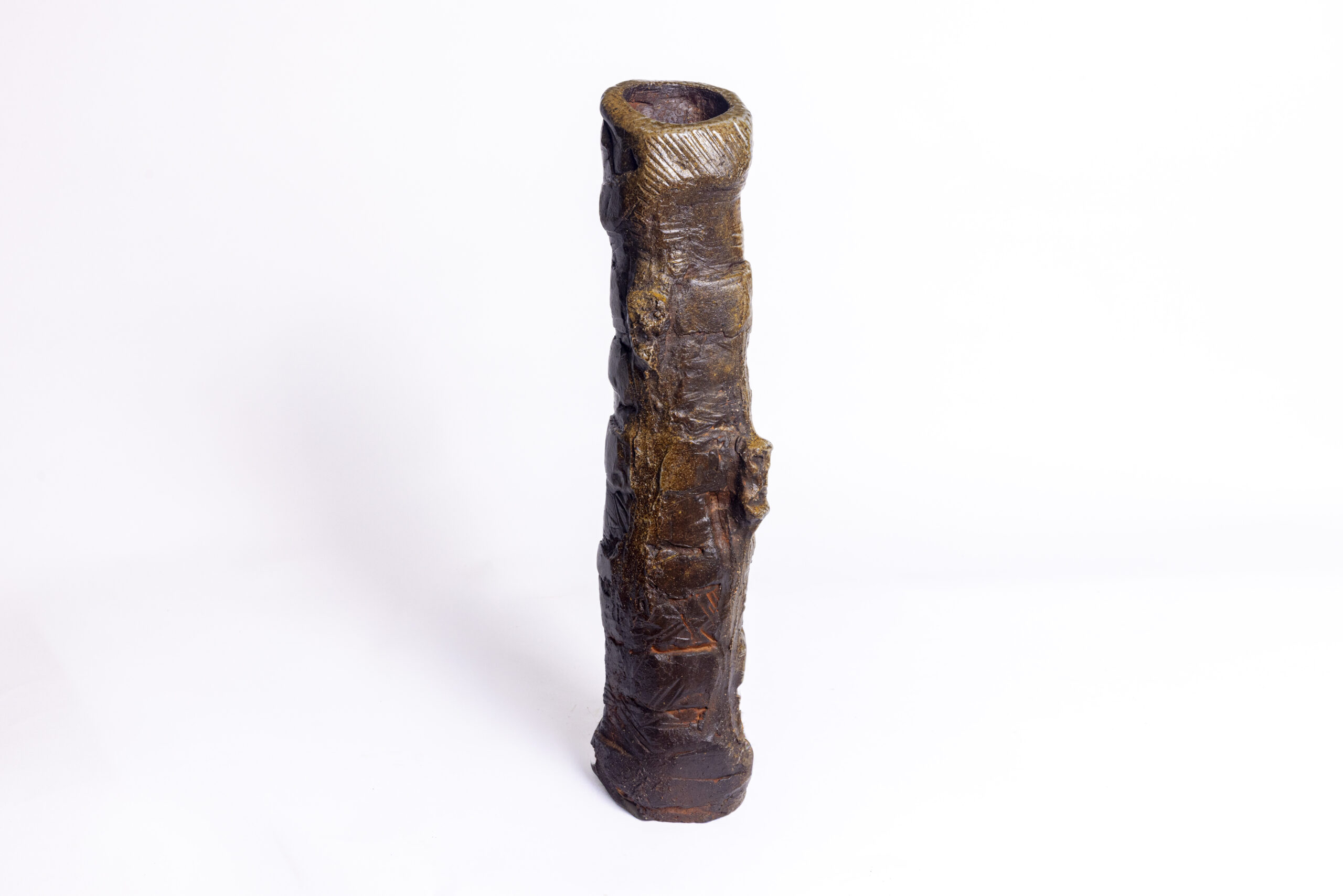 A striking vase defined by strong, bold forms and rich textures — a piece that draws attention.
